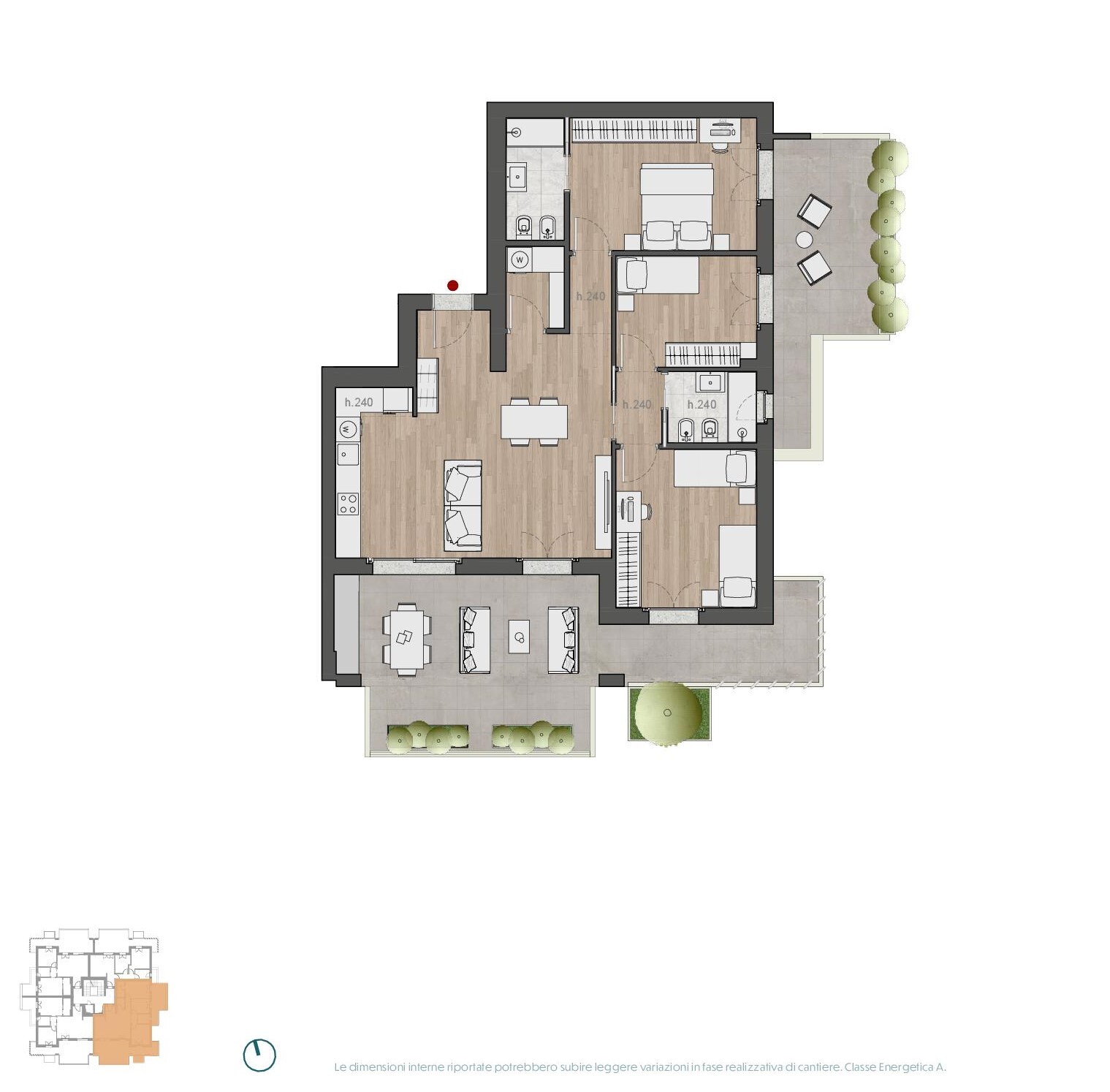 Aurelia New Living Gabetti Nuove Costruzioni e Frazionamenti propone in elegante complesso residenziale Aurelia New Living un ampio quadrilocale al piano quarto attico e superattico con ampie e panoramiche terrazze, perfetto per chi cerca comfort e stile. L'appartamento è composto da un luminoso salone, un angolo cottura ben organizzato, tre camere da letto accoglienti e due bagno moderno. La classe energetica A1 garantisce efficienza energetica e risparmio sui consumi. Attualmente in corso di costruzione, l'appartamento sarà pronto per la consegna a settembre 2025. Il Progetto Aurelia New Living: Aurelia New Living è un progetto residenziale all'avanguardia, concepito per offrire uno stile di vita moderno e confortevole. Il complesso è composto da 10 edifici, ciascuno di 5 piani, progettati con attenzione ai dettagli e alle esigenze abitative contemporanee. Ogni edificio è circondato da ampi spazi verdi e dotato di servizi esclusivi che rendono la vita quotidiana più piacevole e rilassante. Ciò che rende unico questo progetto è lo splendido Wellness Park Condominiale attrezzato protetto e riservato con Piscina, Percorso vita, Area Cani, Portineria, Locker, Videosorveglianza, Sala Polifunzionale con giardino; tutte queste amenities sono ad uso esclusivo dei residenti. Un'oasi verde dove gli abitanti possono trovare rifugio dalla frenesia quotidiana e godere di momenti di relax e svago. Le ampie logge rappresentano un'estensione naturale degli spazi interni, creando un ambiente ideale per socializzare e godersi la tranquillità. Aurelia New Living offre una serie di servizi e strutture che arricchiscono ulteriormente l'esperienza abitativa, tra cui una piscina all'interno del wellness park condominiale, una sala polifunzionale per eventi e incontri comunitari, percorsi fitness, un'area kids e la certificazione LEED© che attesta l'impegno per la sostenibilità ambientale. Questa certificazione porta con sé una serie di vantaggi per gli abitanti in termini di sostenibilità e risparmio energetico. La Zona: Situato in una delle aree più promettenti di Roma, Aurelia New Living gode di una posizione strategica, ben collegata con il centro città grazie alla vicinanza alle stazioni della metropolitana Baldo degli Ubaldi e Cornelia, e vicina a tutti i servizi essenziali. La zona è servita da numerosi mezzi pubblici, scuole, negozi e centri sportivi, garantendo comodità e praticità. Inoltre, la vicinanza a spazi verdi e parchi offre un ambiente ideale per chi ama la natura e le attività all'aria aperta. Contattaci per maggiori informazioni e per prenotare una visita. Scopri il comfort e l'eleganza di Aurelia New Living! Ufficio Vendite in loco: Via della Vignaccia 45, Roma