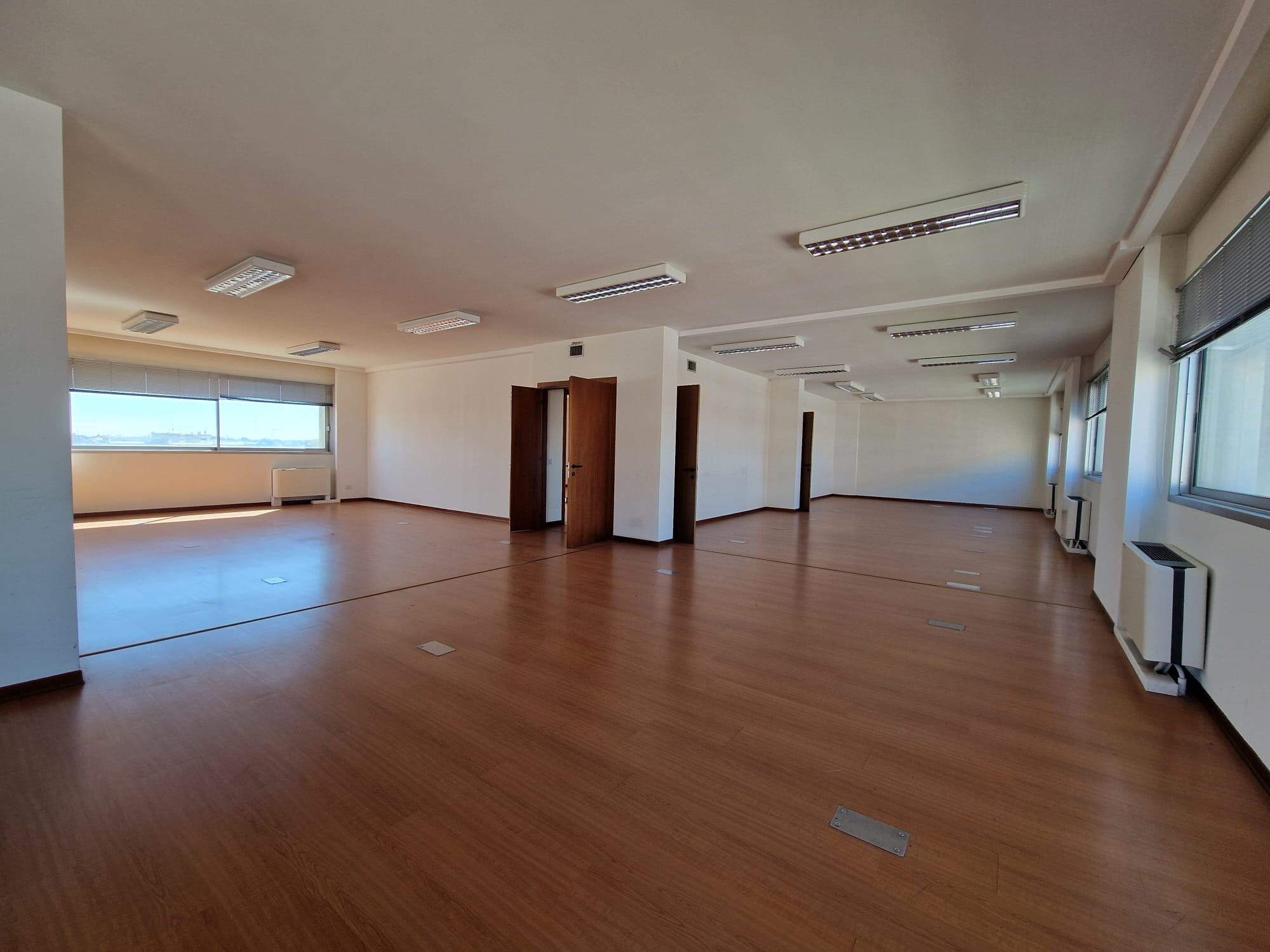 La distribuzione attuale prevede cinque vani, ampio openspace, sala riunioni e quattro servizi igienici con antibagno.